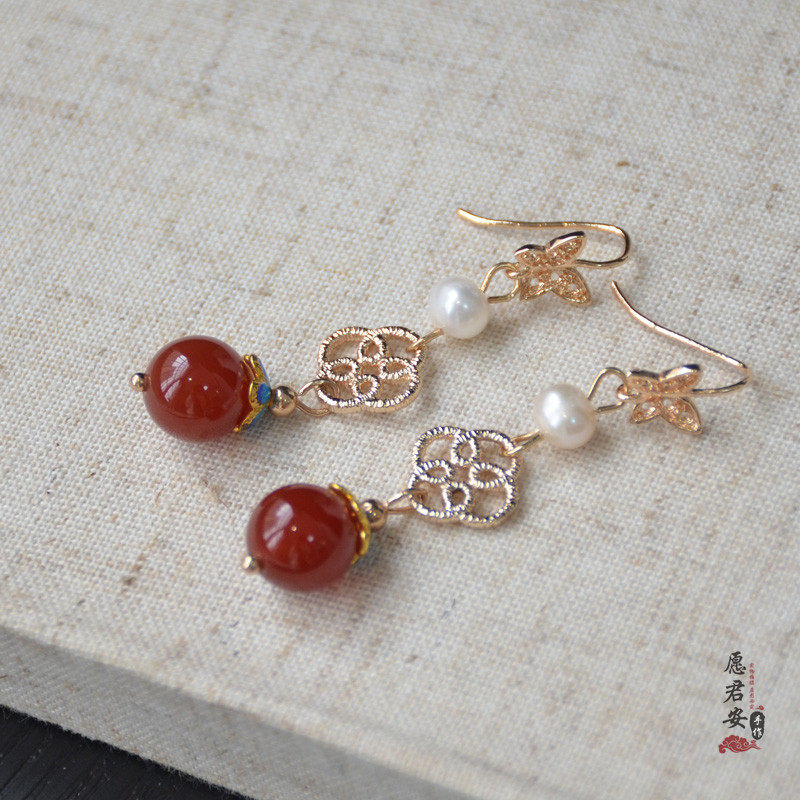愿君安手工原创设计耳环气质红玛瑙复古耳饰淡水珍珠耳夹热门设计联盟服务商